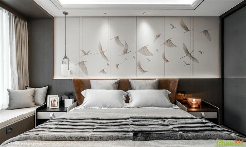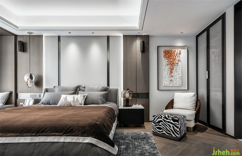 長(zhǎng)輩房,感受到的是獨(dú)處時(shí)的平和寧?kù)o,頂層復(fù)式設(shè)計(jì)更偏向于中式現(xiàn)代風(fēng),用實(shí)木、皮質(zhì)、棉麻等材質(zhì)填充視野,無(wú)主燈設(shè)計(jì)讓光影更柔和自然,突出舒適宜居的氛圍感。