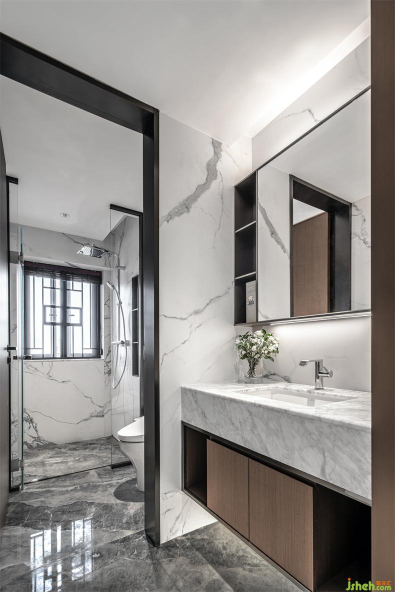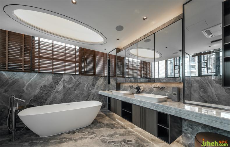 主衛(wèi)大塊面的玻璃間隔,令空間產(chǎn)生視覺上的想象和延展。一輪橢月與地面對應(yīng),象征季節(jié)輪轉(zhuǎn)與人間圓缺,地面大理石的肌理,大氣寬敞的雙臺盆與墻出水龍頭設(shè)計,處處都在體現(xiàn)著男女主人尊貴的地位身份。