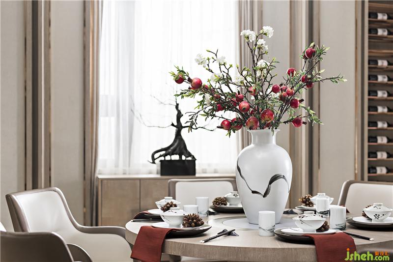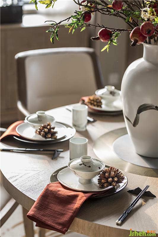 餐廳處放置小巧的新式木質圓桌,中式餐具,大膽采用火紅的石榴裝飾,舒適的靠背椅,亦中亦西,融匯在此人間煙火之地。