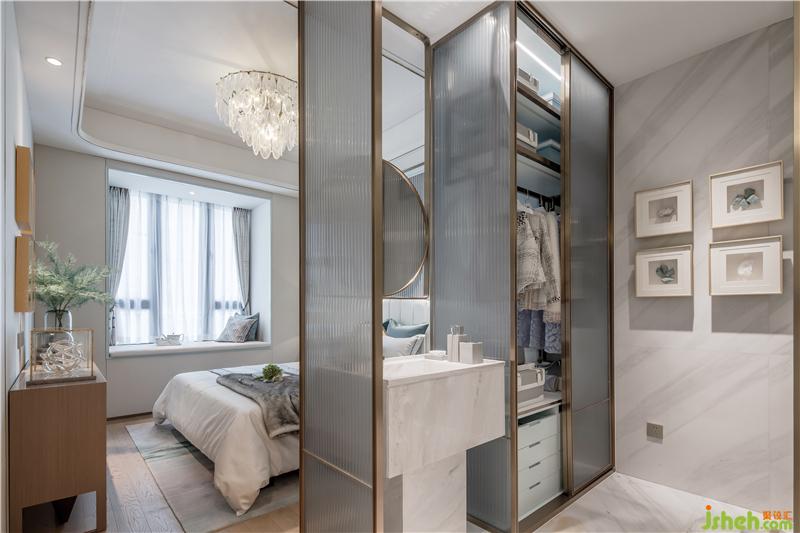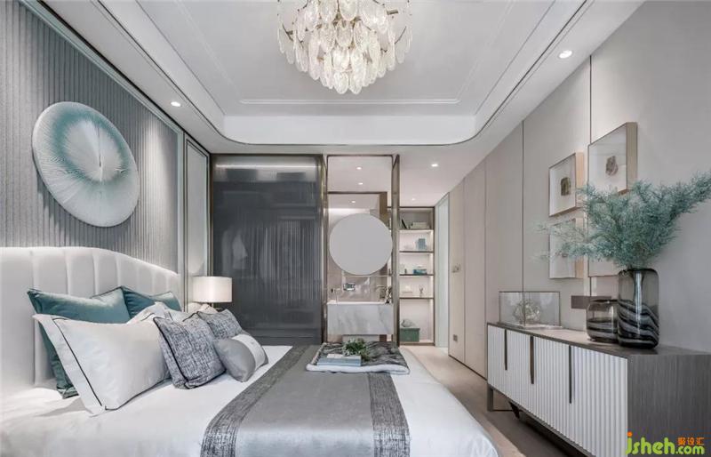 臥室是人們心所歸處。主臥利用步入式衣帽及展示柜。開放式主臥衛(wèi)生間、衣帽間、女主人的化妝臺交叉功能,樣板房設計面積配比不再是局限。蒂芙尼藍柔和的色彩提升幸福感和歸屬感。時尚與美學在其中跳躍,驚起一絲慵懶與愜意的波瀾,又平添一份驚鴻一瞥的包容。