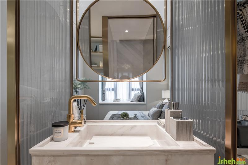 獨立的洗手臺面和懸吊的藝術掛鏡,無一不彰顯獨家定制的私享品質感。藝術空間給予了人們對生活的美好向往。未來家庭生活的憧憬讓整個主臥空間浸潤在藍寶石般的幸福感之中。