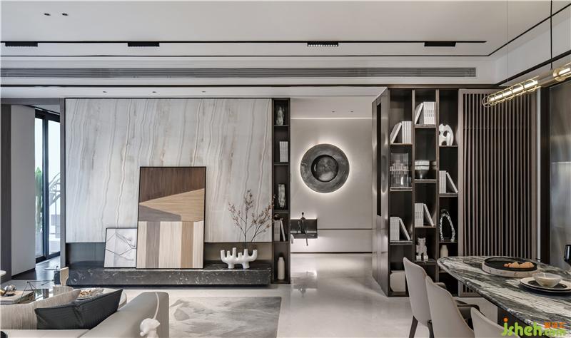 客廳空間衍脈自深厚邈遠的傳統(tǒng)文化,以簡練現(xiàn)代造型與線條體現(xiàn)細節(jié)美感,從家具的形制、流線、色澤,到墨枝斜逸、書法掛畫,均鐫刻著東方詩性的肌理,流露出自信大方的悠悠風骨。