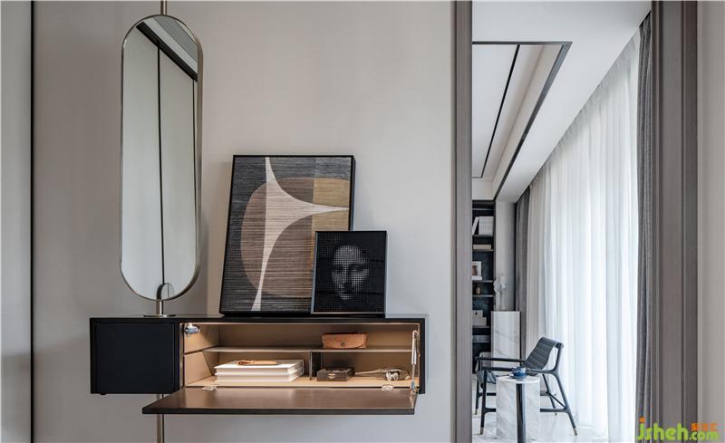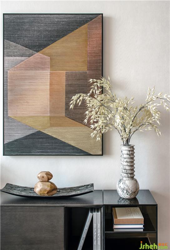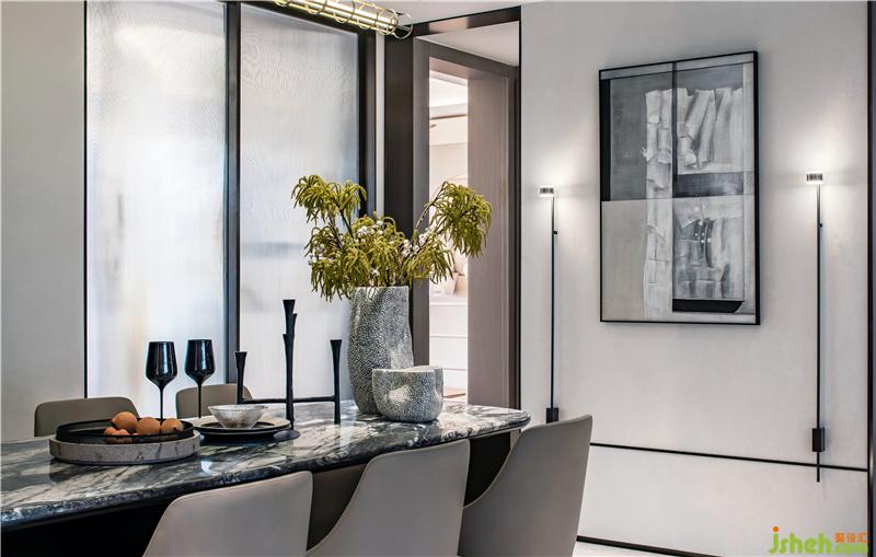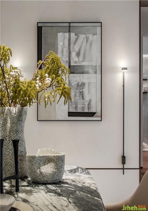 意趣在空間中無所不在,大理石質感的餐桌,現代雅致的餐桌椅,搭配一盞簡約的吊燈,呈現出優(yōu)雅舒適的用餐氛圍,而墻上的裝飾畫,讓空間更有想象藝術感。游歷其間,有如娟娟如洗的自然清新、有如氣質韻成的情濃境深。