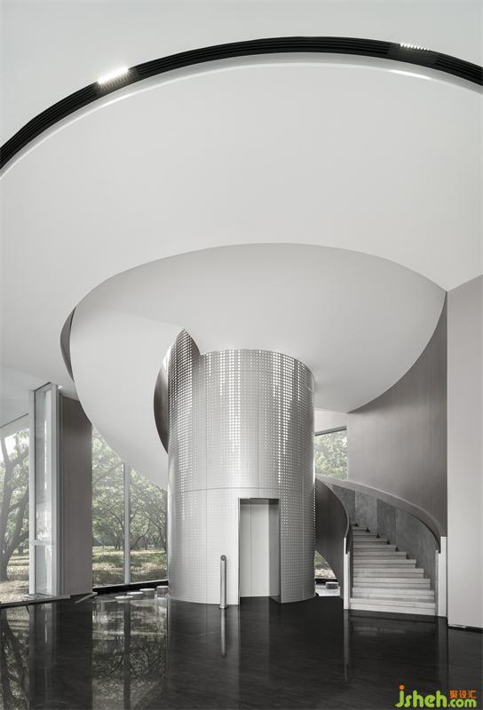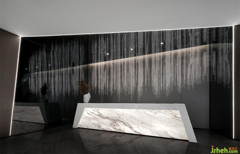 瀑布圖案+沖孔鋁板可視化呈現(xiàn),像星河傾瀉,從前廳旋轉(zhuǎn)樓梯的表面更新形成信息流,盤旋向上傳遞到二層前廳,充滿流動(dòng)的前衛(wèi)科技感。