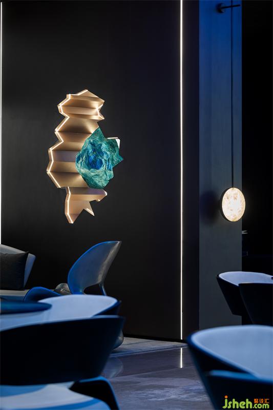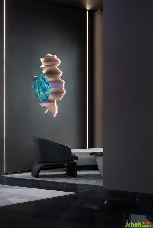 營銷中心設計墻體隕石裝置藝術來自雕刻家霍奇斯,他選用了搶眼的金屬色系和不銹鋼材質,巖石的設計參照了星際的夢幻,為冰冷的石塊注入一絲絲溫度,這樣的做法使得這些巨大的巖石無形中被點綴上了神圣的色彩。