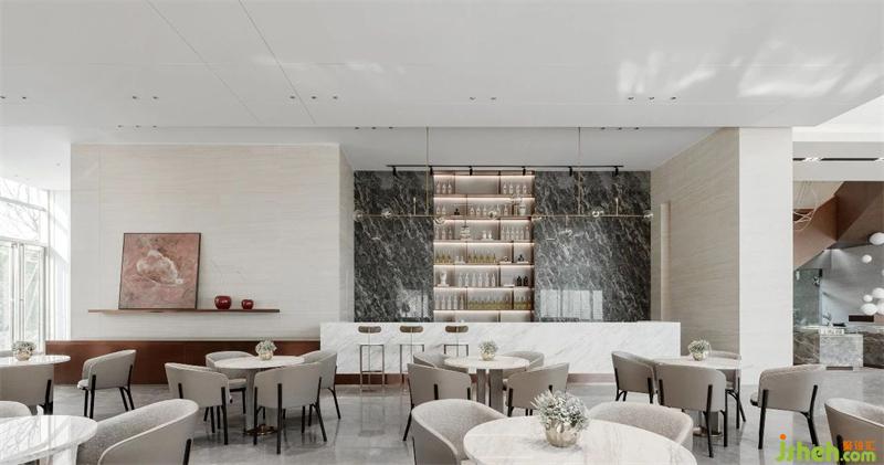 高度靈動的色彩呈現(xiàn),構(gòu)造簡單干凈的空間,給充滿年輕活力、網(wǎng)紅藝術(shù)的武漢本土帶來城市先鋒藝術(shù)色彩的生活體驗(yàn)館。體驗(yàn)中心設(shè)計(jì)格柵式線條重組成體塊用以分割空間功能且為空間帶來互動體驗(yàn)。體塊拼接的水吧臺與酒柜形成充分的構(gòu)成至簡美學(xué)風(fēng)尚。
