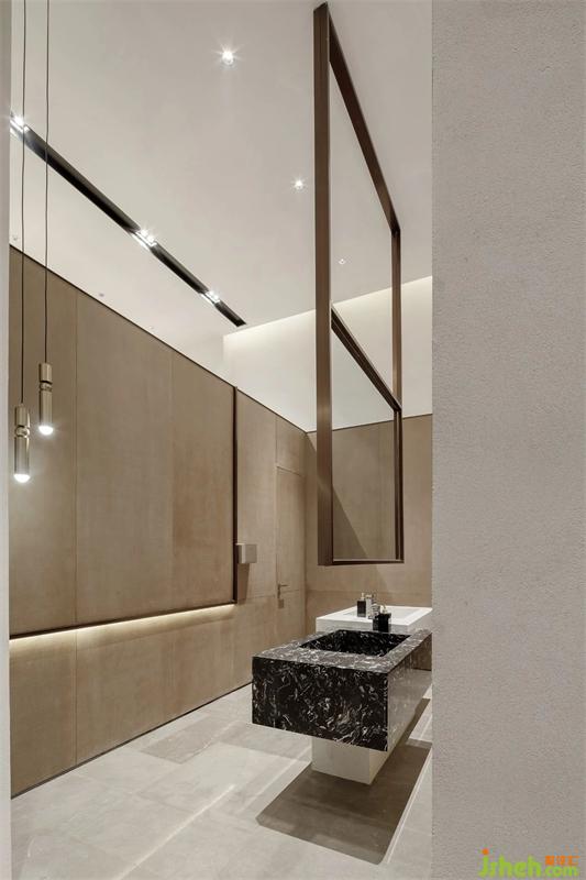 衛(wèi)生間盥洗區(qū)空間懸吊線條感的體塊,同時(shí)將洗手臺拆分重組形成錯(cuò)位拼接的體塊,墻面也是由一條金屬構(gòu)件藏光的手法加以藝術(shù)吊燈以硬朗的線條藝術(shù)切割空間,大面積暖色木飾面營造舒適自然的氛圍,使其在空間立體中變成那一處光芒。