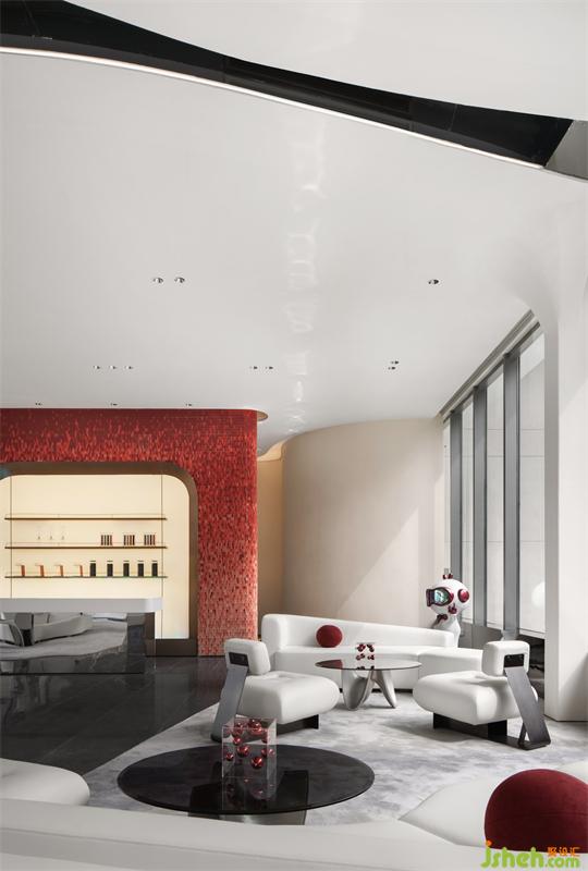 進入室內,隨著空間氣氛而起伏的優(yōu)雅弧線中,射燈鑲嵌其中,不露聲色地隱匿在頂部上空。拱券結構帶來豐富的層次體驗,如多幕劇戲劇的低調出演,一幕一幕地表達出空間內涵。無論居于空間的哪個位置,均能欣賞到不同樣態(tài)的風景。各功能區(qū)既相互獨立,又彼此依存,蜿蜒曲折之間,空間隨之煥發(fā)無限的生命力。