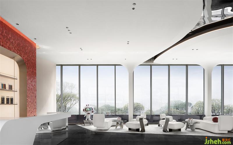 洽談區(qū)的設(shè)計打破傳統(tǒng)做法,融入咖啡吧+書吧+潮玩集合地的設(shè)定,將潮玩與工藝器具集合展示,盡顯活潑與趣味性,臨窗而坐,這里可以飲茶、讀書,也可以交談、小憩。