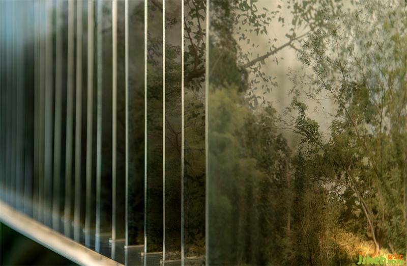 步入大廳左邊的門,比人先到的是漏出一角的天幕和綠光:一個“光之森林”以上下倒置的天幕+沙盤藝術裝置呈現(xiàn)在眼前。生活體驗館設計水磨石地板上托出一座光滑的石盤,石盤里是這座城市縮小的樣子。圓形的天幕從涂著綠色肌理漆的洞口漏下,日光從一旁的玻璃磚落地墻透出,綠色、黑色、白色交織在光之森林里,生命力和神秘力量流轉在空氣中,忙碌的城市靈魂在這一隅得到喘息。
