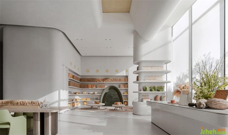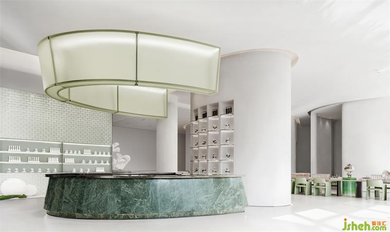 蘆葦蕭蕭吹晚風,畫船長在雨聲中。青一塊、白一塊,離不開,留下來。一條環(huán)形的“碧綠河流”繞著石子和蘑菇,滋養(yǎng)著背后的一大片蘆葦灘,也呼應著此處水紋亞克力裝飾的天花。抬頭是波光粼粼,低頭是青翠飄逸,露珠狀的燈飾、蘆葦和石子裝置在沉浸式的洽談區(qū),圍合出這處鬧中取靜的弧形體驗區(qū)。