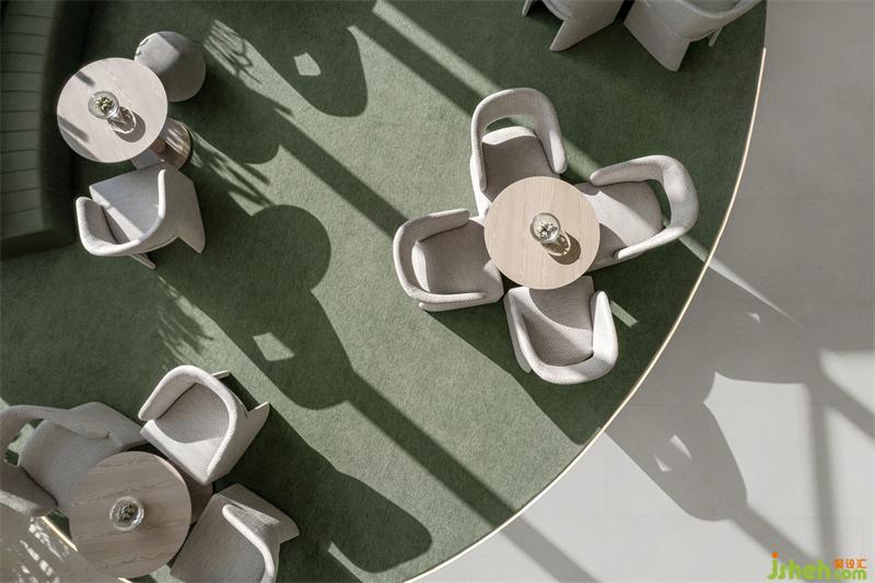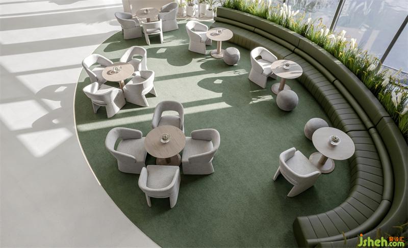 洽談區(qū)以清新的森林綠調(diào)為主,穿梭其中,你會發(fā)現(xiàn),每個區(qū)域看似分割相離,實際上卻是相互連通。無論選擇從何處進入,最終都將前往同一個目的地——布置得像森林茶話會般的洽談區(qū)。多重路徑的統(tǒng)一指向,讓中庭的洽談區(qū)自然而然成為空間動線上的社交焦點。生活體驗館設計橢圓形綠色地毯上放置著多個沙發(fā)組合,有的圍合,有的單置,幾顆圓形米色矮凳像是雨后草地上長出的蘑菇,又像是小溪旁的石頭,忍不住讓人上去坐一坐。在濃郁的自然氣息下,在大幅落地窗引入的戶外景色中,在隨意游樂玩耍的體驗感里,人們的感官沉浸于虛實相映的森林奇境。