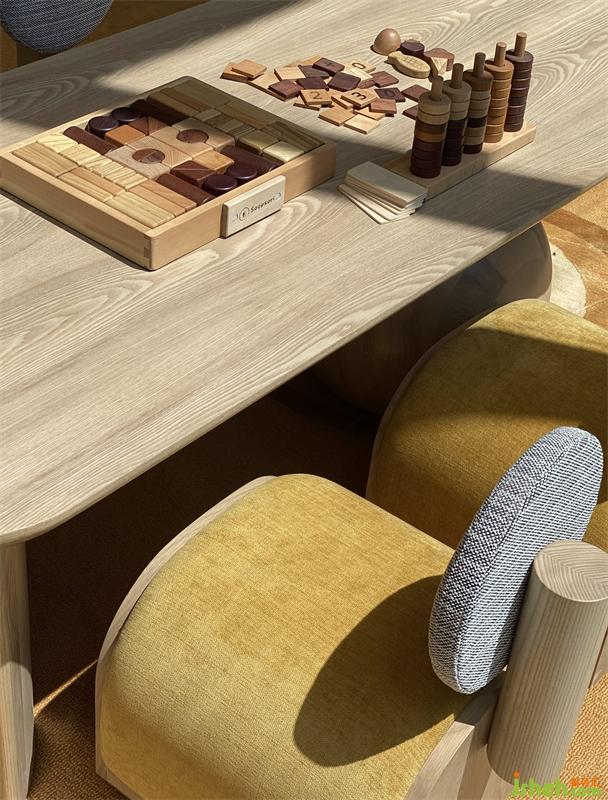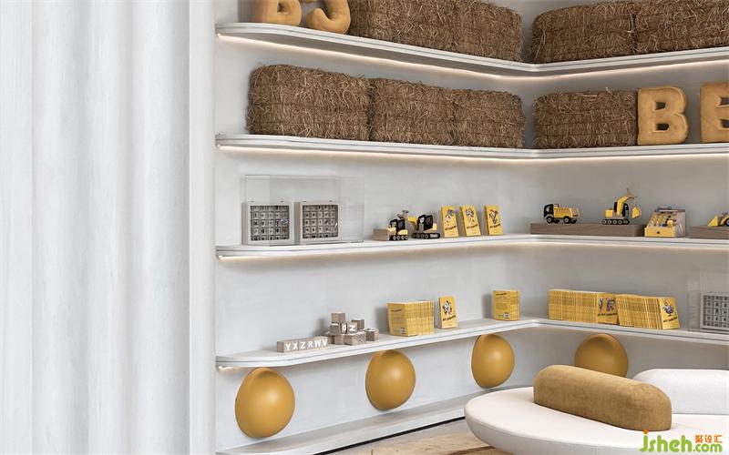 白色“原木桌”浮在漣漪狀暖色漸變地毯上,就像漂在池塘水面,生活體驗(yàn)館設(shè)計(jì)周圍的純白墻面懸空布置著稻草垛和字母面包,仿佛只要招手,這些大自然的香甜饋贈(zèng)就即刻到來。谷倉工坊還承擔(dān)著空間里的互動(dòng)功能,只要你愿意,就能在此進(jìn)行食物DIY。