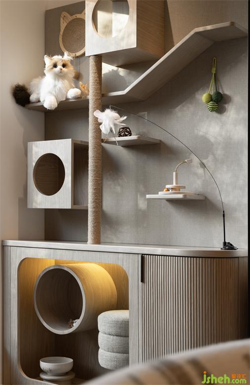 從客廳為始,便是貓咪的快樂游戲場,透過弧線,釋放出線條的纖柔細(xì)細(xì)致,柜體內(nèi)更隱藏了貓砂盆,與貓?zhí)_、貓走道、多處棲臥地,完美將動線與儲物承載著家庭成員對未來生活的期許,廈門湖畔潤璟樣板房設(shè)計以靈活多變的布局,完備的功能分區(qū),自然與藝術(shù)的點綴,描繪出居者向往的棲心之境。