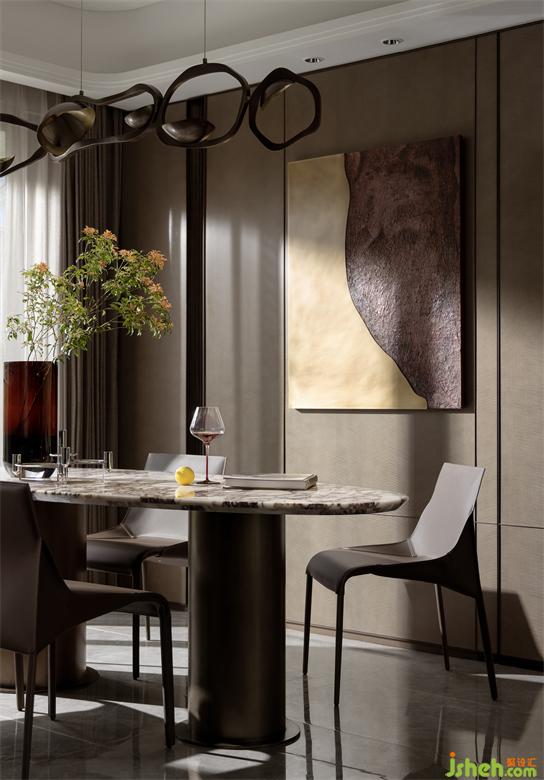 細(xì)膩的寶格麗大理石鋪陳瑰麗,與金屬交織出細(xì)致的層次秩序,精致簡潔的語匯給人品質(zhì)感的升華。廈門湖畔潤璟樣板房設(shè)計造型新奇的玻璃燈飾,規(guī)則形狀的玻璃花瓶,讓餐廳的氛圍趣味且跳脫,打破了同質(zhì)化的設(shè)計思維所帶來的沉悶與無味,構(gòu)建藝術(shù)與功能并行的空間體系。