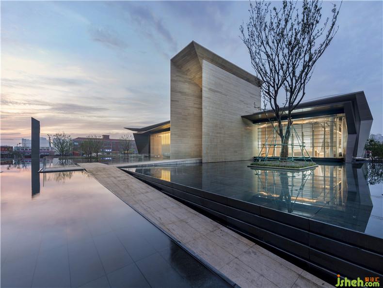 在建筑的外立面我們設(shè)計了一個光的水幕墻,來呼應(yīng)”水”的主題。光的水幕墻是由LED燈組成,燈帶跑動后形成水幕的效果,倒映于水面,與水池相交相輝映。水幕墻有兩個面,對外形成建筑的一個立面,同時也是室內(nèi)的一個背景墻。室內(nèi)設(shè)計師