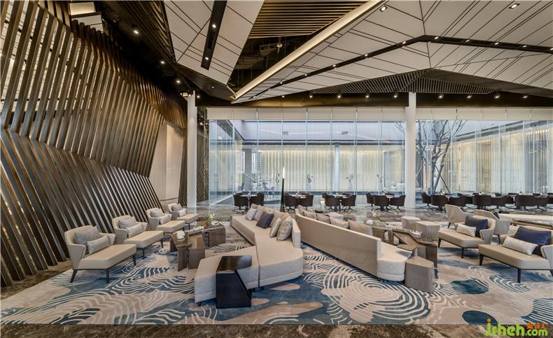 室內(nèi)為展示區(qū)和洽談區(qū),運用了具有幾何感立體格柵構(gòu)成了墻面進行空間的隔斷。洽談區(qū)旁是由連續(xù)的玻璃墻面環(huán)繞水池而成的中庭景觀,成為了室內(nèi)的一個景觀點。室內(nèi)設(shè)計師