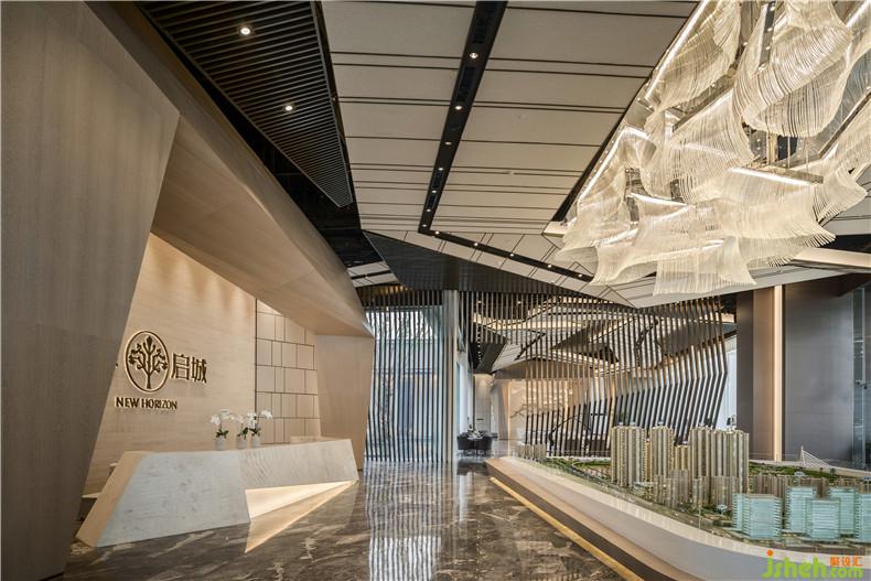 建筑前方置入了一個非常大的景觀水池,整個建筑如同漂浮在水面上。一個約50米走道切開水面連接了售樓處的入口,可以由此緩緩進入室內(nèi)空間。進入室內(nèi)前會通過一個由輕薄的石材墻面組成的16米高的入口,空間高聳遠觀側(cè)面如同折紙。從外部開闊的空間進入壓縮的入口通道后再進入開闊的室內(nèi),形成了有縮有放的空間的律動,整個過程充滿了儀式感。室內(nèi)設(shè)計師