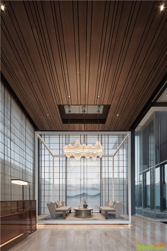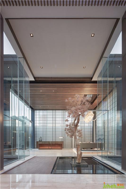 入口接待處茶亭搭配山水紋夾絲玻璃
