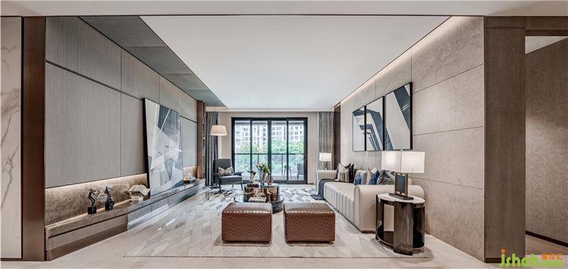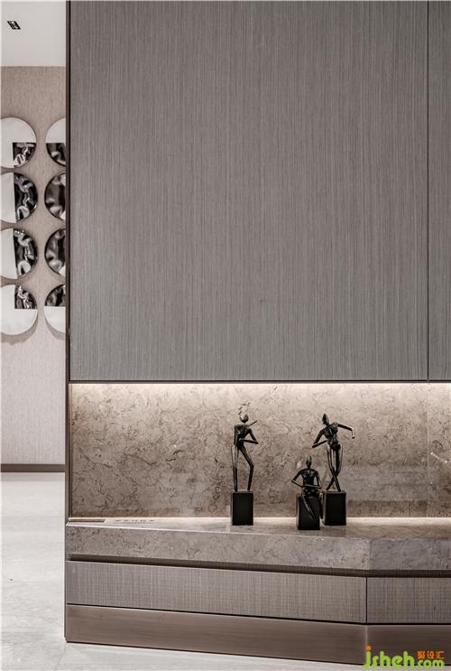 整個空間擯棄紛繁復雜的裝飾造型,以大面積的米色勾勒出空間墻面的底色,樣板房設計配以素雅的米色石材地面,再輔以深棕色作點綴,在柔和的自然光線下營造出靜謐閑適的氣質。