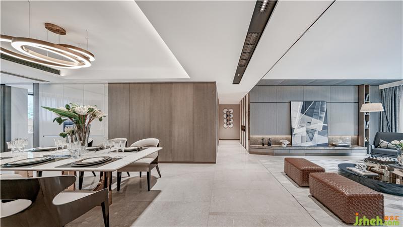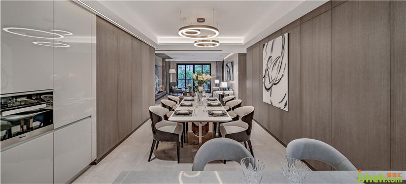 起居室、餐廳、廚房一體化設計,弱化功能區(qū)域的界限,增強室內空間的通透感,提升空間的尺度感。一體化的設計強調空間的連續(xù)性,空間相通,形成一個較大的視覺縱深,空間層次更豐富,具有更強的流動性。