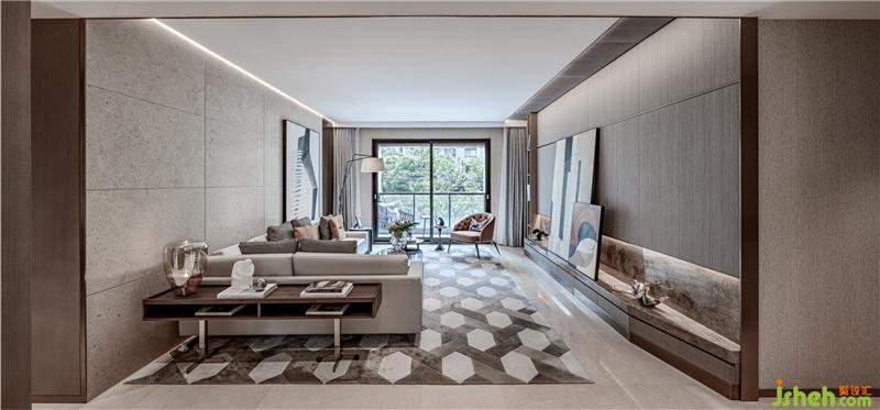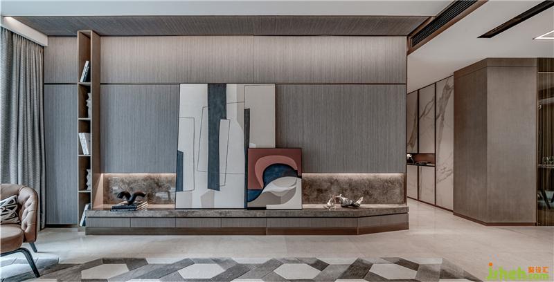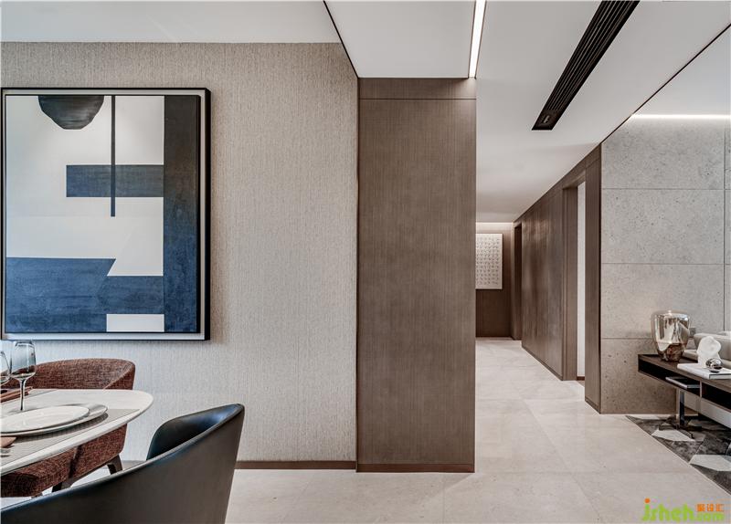 公共空間開敞式的設計帶來開闊的空間感受,入戶后從玄關至起居室、餐廳,層層遞進,光線和自然之景的引入,讓空間中的每一處都是輕松愜意的。溫暖柔軟的材質(zhì)布滿人體所能接觸的地方,同石材背景墻形成軟和硬、光滑與粗糙、溫暖與清冽的對比。