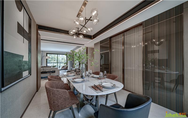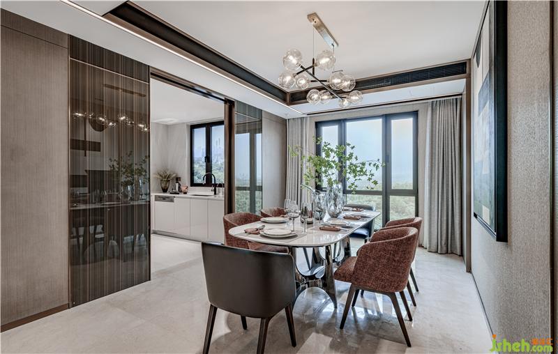 餐廳延續(xù)客廳的調(diào)性,米白暖棕調(diào)所呈現(xiàn)出的溫暖與寧靜,與整個空間和諧呼應。樣板房設計餐廳與廚房棕色夾絲玻璃的運用,通透又獨立,面向花園的景觀餐廳不錯過每個季節(jié)的精彩。