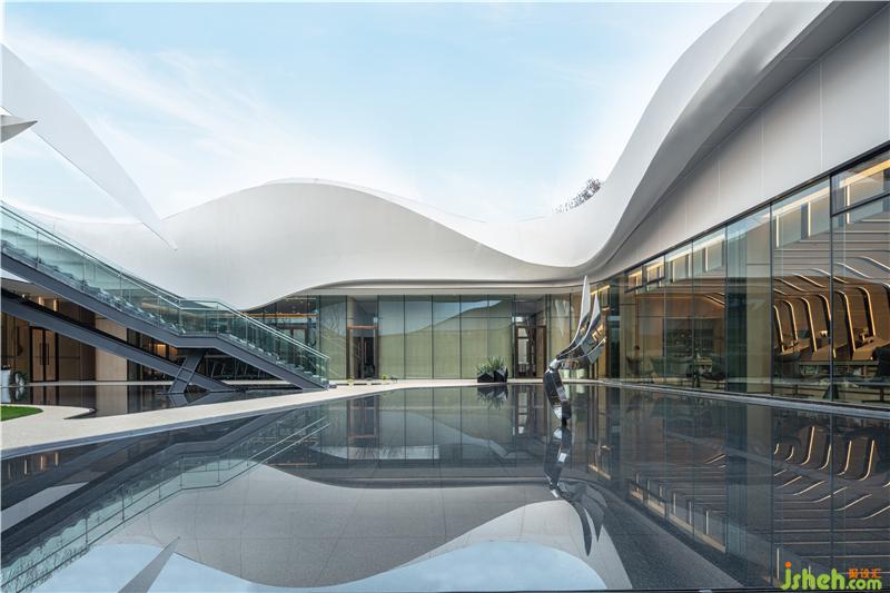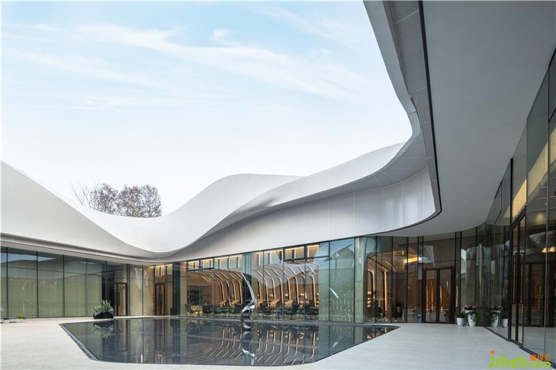 流動的屋面形成自然起伏的山巒形態(tài),線條有機流動,呼應了基地周圍山巒的柔美與飄逸南京售樓處設計,盡顯靈動。不管人身處庭院中或是地面,步移景異,此起彼伏。