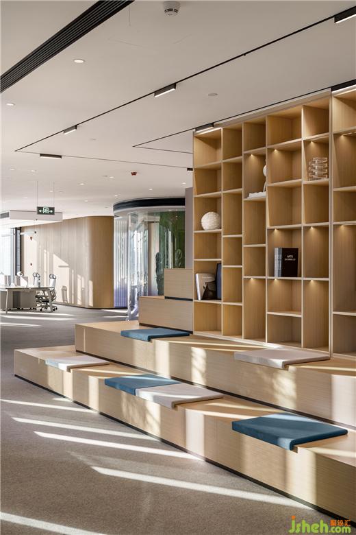該方案整體的設(shè)計(jì)以原木設(shè)計(jì)搭配空間的黑白灰色調(diào)為主調(diào),辦公室設(shè)計(jì)整體的方案設(shè)計(jì)考慮到空間視野的開闊以及利用到室內(nèi)采光的設(shè)計(jì)效果。設(shè)計(jì)師通過簡(jiǎn)約的設(shè)計(jì)手法運(yùn)用,營造出嚴(yán)謹(jǐn)開放、靈活穩(wěn)重的多維可能,隨著空間的明暗律動(dòng)延綿起伏。拋棄一些繁瑣的設(shè)計(jì)表象,還原空間最真實(shí)的目的表達(dá),一些局部的公共空間以弧形的形式的布局,外立面采用了藍(lán)色玻璃漸變的隔斷設(shè)計(jì),暖色條頂燈隨性進(jìn)一步呈現(xiàn)室內(nèi)舒適的辦公氛圍。在整體的環(huán)境中設(shè)計(jì)了一處閱讀處,階梯式分布不規(guī)則的跳色坐墊設(shè)計(jì)打破常有的生硬的閱讀空間,同時(shí)在整體的辦公空間中增添了很多綠植,營造更為舒朗的辦公工作棲居,綠植與原木風(fēng)暖色的相結(jié)合給予人與空間更自由的呼吸和辦公空間。