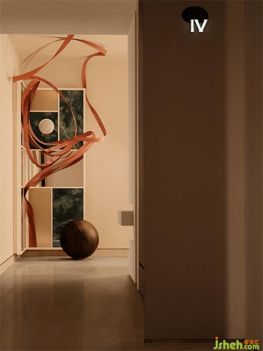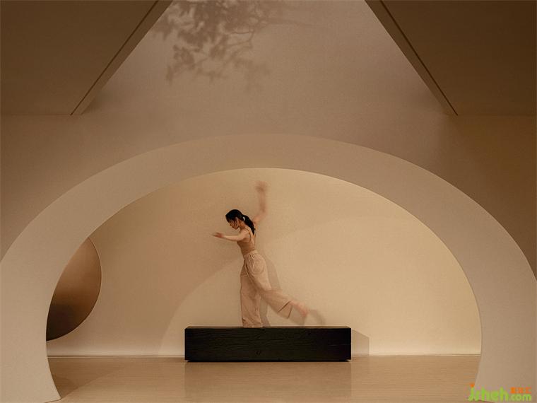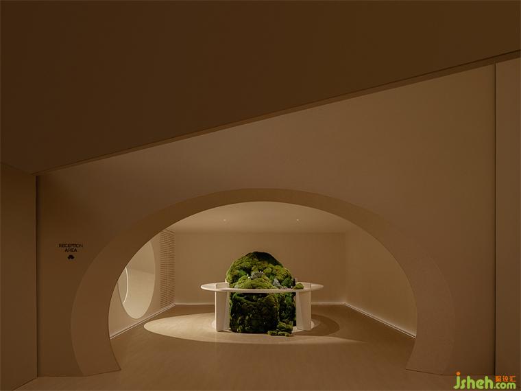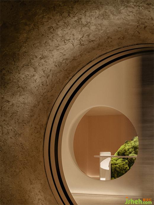 步入空間內(nèi)部,難以看見棱角分明的空間體塊,富有精美視覺體驗的曲線感充斥著人們的視野,圓潤的洞口如氣泡一般,有機地銜接著不同的空間。