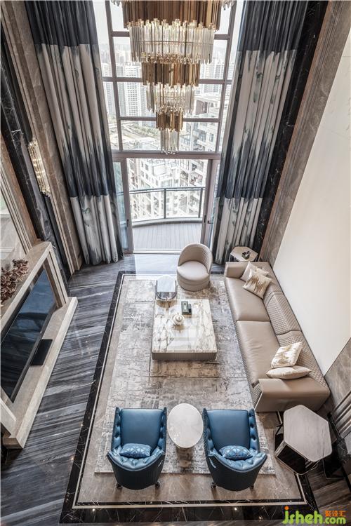從玄關(guān)進(jìn)入挑高開闊的客廳,灰色大理石與水晶吊燈碰撞出的藝術(shù)張力,兼具秩序感與靈動(dòng)性,點(diǎn)綴天海般純凈的藍(lán)色,演繹出浩瀚蒼穹,這源于人們對(duì)于山巒、流水、叢林、天空天然的向往,它們一方面象征著自然力量,可以不斷滋養(yǎng)內(nèi)在精神,一方面溫潤柔軟,總能帶給生活許多靈感和滋養(yǎng)。