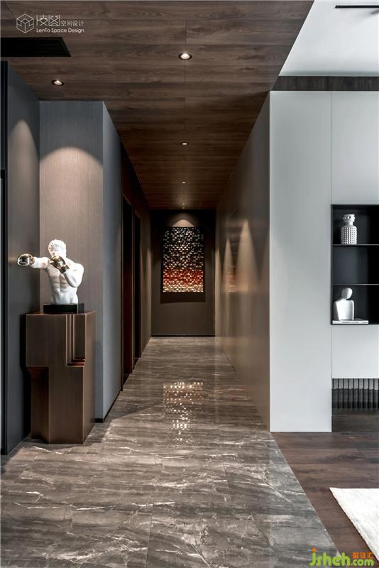 客廳與狹長的通道組合延伸,弱化了門的存在,使整個空間化零為整。輕巧的內(nèi)飾,斑斕的裝飾畫,一路延伸至視線盡頭的燈光,淡雅而寧靜,讓心靈猶如被泉水浸透過一般。