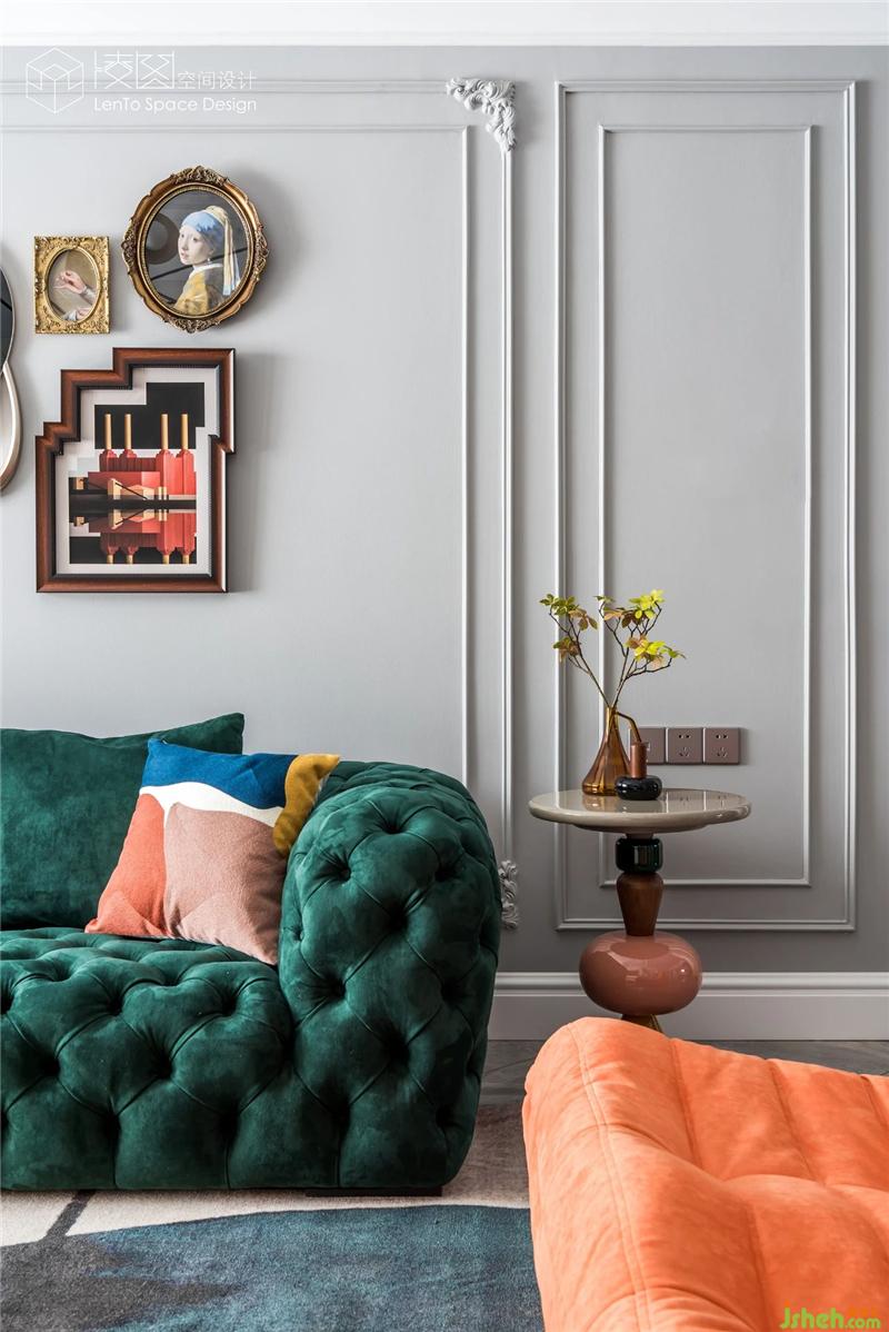墨綠色的酒柜與客廳沙發(fā)的色彩,