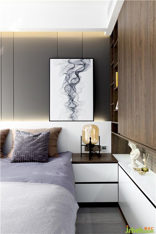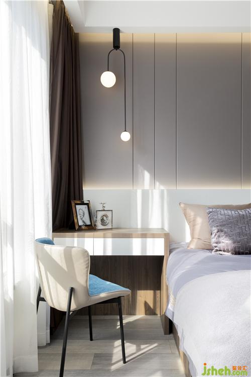 PS:本案整木整體定制無靠背帶儲藏功能床鋪、撞色梳妝臺、床頭柜及書桌、整體隱形拉手、外蓋柜門及抽屜,有效提升整體感。裝修公司