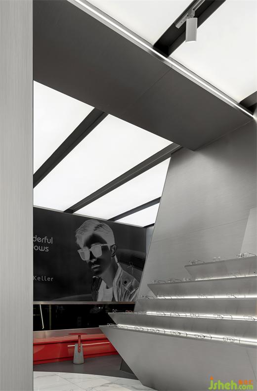 金屬質(zhì)地需要光線烘托,在建筑框架內(nèi)尋變化。林彥先生的設(shè)計(jì)語言簡(jiǎn)潔利落,展廳設(shè)計(jì)通過這種調(diào)性營(yíng)造出品牌的專業(yè)屬性。“整個(gè)配鏡過程希望如精密實(shí)驗(yàn)般考究精準(zhǔn)”扶生如是說。