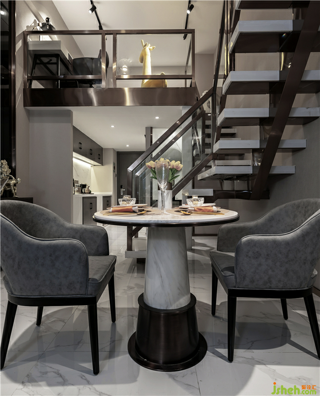 在淺灰咖的主體之下,暖色的光在晶瑩剔透的玻璃與金屬銅碰撞之間透過(guò)空氣彌漫開(kāi)來(lái),而石材肌理的顯性表現(xiàn),以及時(shí)尚趣味的藝術(shù)紋理亞克力巧妙融合在一起,將這空間的內(nèi)在韻味猶如畫(huà)卷平鋪開(kāi)來(lái)。