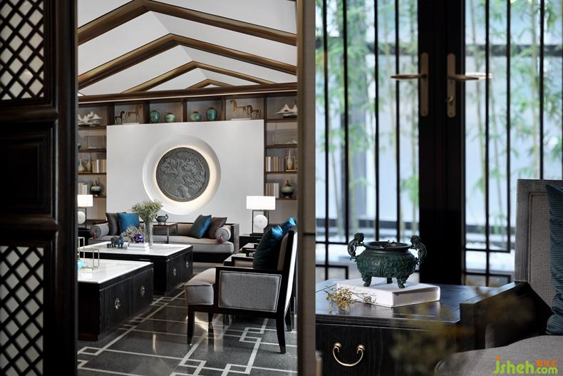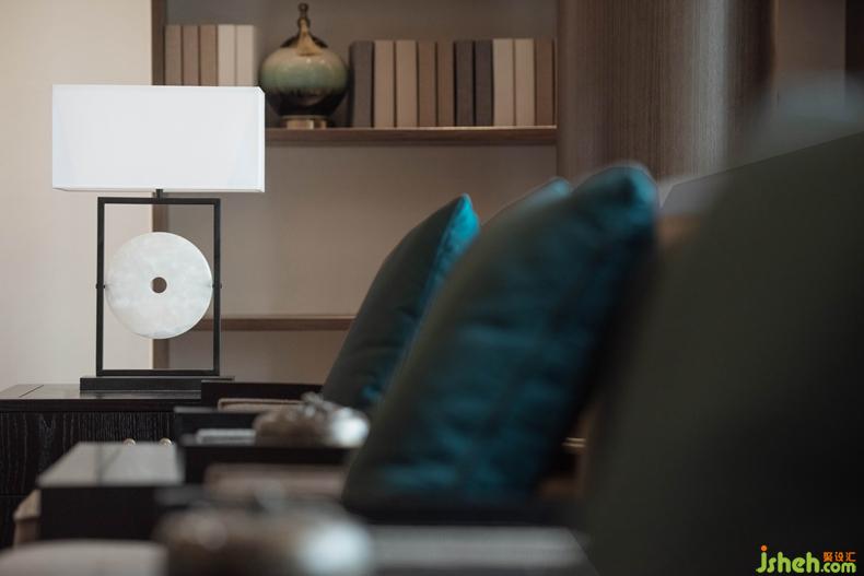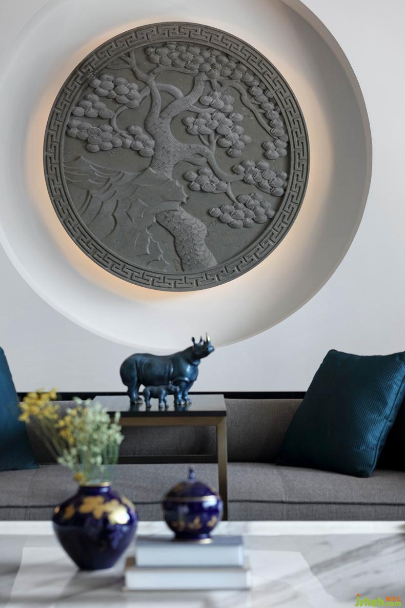 圓形玉石宛芳一輪明月,精選晶石及用料,圖案和肌理彰顯出巨大的張力,有種紛紛世態(tài)長松影,荏苒時光流水聲?;腥裟荞雎牪贿h處傳來的悠然綿長的鐘聲,那理不清道不明的凡塵舊事紛紛塵埃落定。博古架上青花瓷、古玩、木雕穿越時代之潮,循古人履易,玩古出新。