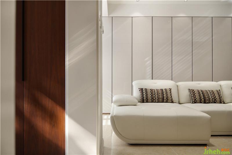利用客廳西面墻凸出的承重柱做一組嵌入式裝飾柜,提供儲物功能;