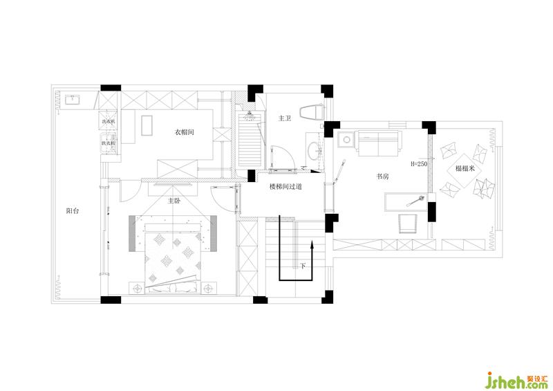 二層樓梯南邊的空間是下沉的,如果保留原有的下沉樓梯勢必會將一個大空間“攔腰斬斷”,為避免這個局面,設計師將原有的下沉樓梯封掉,改在東邊,介于南面空間和樓梯之間,這樣就保持了南邊空間的整體性;利用陽臺和承重墻把空間隔成成女兒房和衣帽間,形成套間;