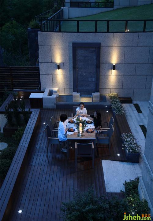 錯落有致的臺階暗藏柔和的燈光,水幕墻作為中庭背景,防腐木地板序列排布,搭配冷峻的灰色石材,別墅裝飾草皮上的石板不規(guī)則感、隨性自然,花草點綴其間,舒適閑雅的現(xiàn)代庭院以此呈現(xiàn);