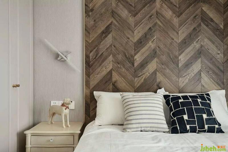 床背景室內(nèi)設(shè)計師采用了人字形地板,配上低調(diào)又不失質(zhì)感的壁燈,線條簡潔的家具襯托下,突顯優(yōu)雅的時尚韻味。