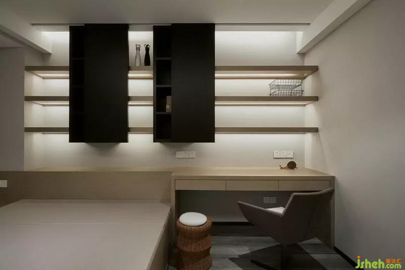 書房于客廳僅一扇移門為界,室內(nèi)設(shè)計(jì)師用通透的玻璃讓兩個空間保持獨(dú)立的同時增加了許多互動感,釋放了空間的可能性。