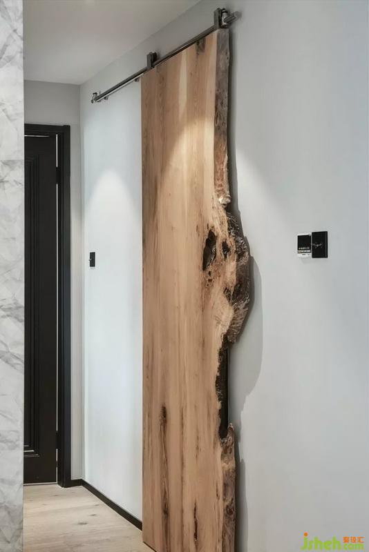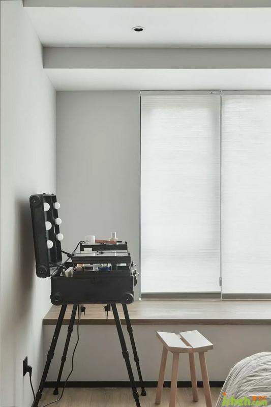 衛(wèi)生間室內(nèi)設(shè)計師選用獨立浴缸,發(fā)光的地臺劃分干濕區(qū)。木紋磚使本作品的“氣質(zhì)”一貫而終。