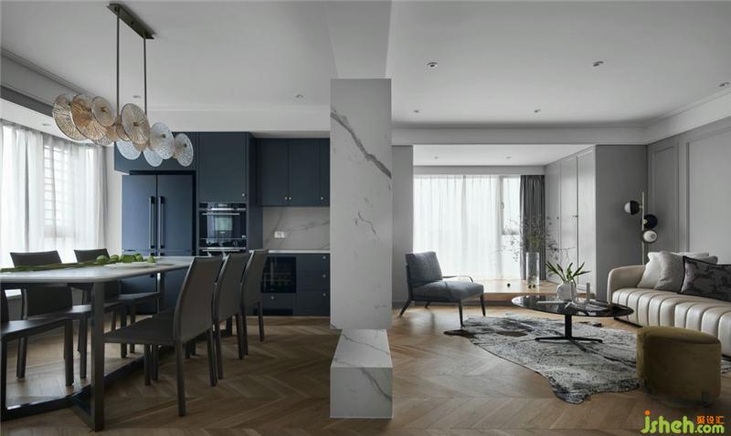 客廳、餐廳、廚房三者的開放式布局,流暢靈活,懸空的電視墻巧妙的劃分空間,提升社交娛樂功能的靈巧性,增加家人之間交流互動(dòng)的美好生活氛圍。