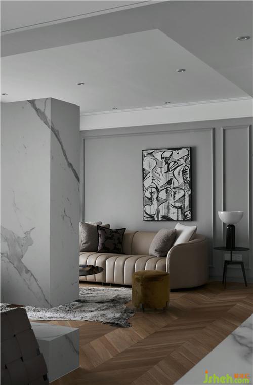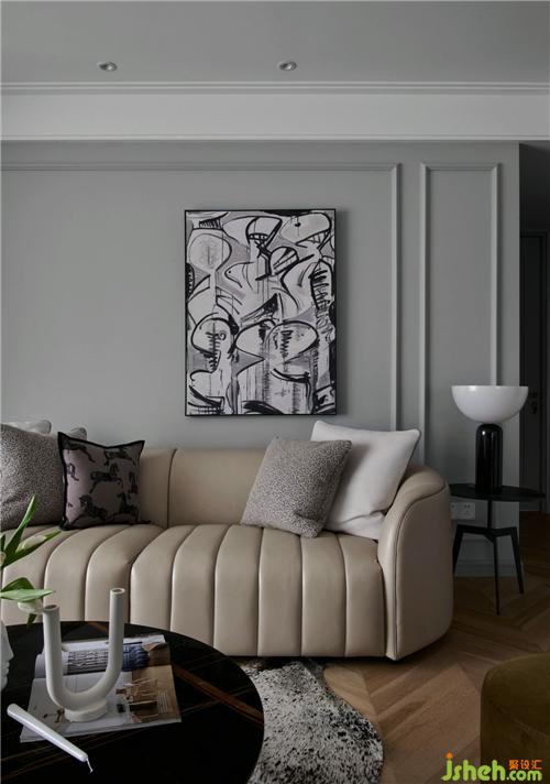 淺灰色的墻面搭配原木的地板裝修公司,溫暖而雅致,黑白抽象掛畫凸顯了空間的現(xiàn)代時(shí)尚觸感。