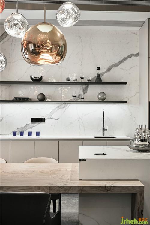 餐桌和吧臺(tái)的結(jié)合形式,除了滿足日常就餐,更增加了生活的儀式感。Tom Dixon的MELT系列吊燈極具未來(lái)感,像一組空間雕塑,不同紋路的巖板臺(tái)面也非常具有質(zhì)感,和家人一起在這里準(zhǔn)備點(diǎn)心、美食、聊天、分享趣事,這幸福的味道,大概就是“人間煙火氣,最撫凡人心”了吧。