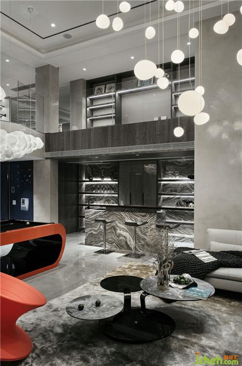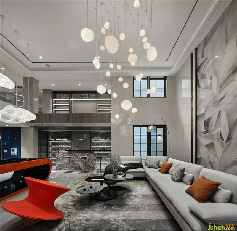 負(fù)一層挑高的空間讓地下室通透感十足,不同以往地下室低矮的壓抑感,愛(ài)馬仕橙的臺(tái)球桌和陀螺椅子,羅奇堡的旋轉(zhuǎn)茶幾,別墅裝飾搭配空中星星點(diǎn)點(diǎn)的不規(guī)則月球燈和云朵燈,整個(gè)空間充滿了奇幻趣味感。