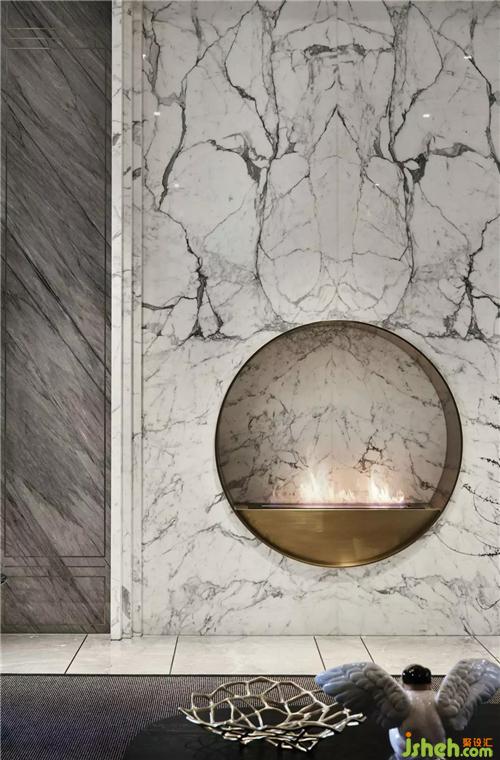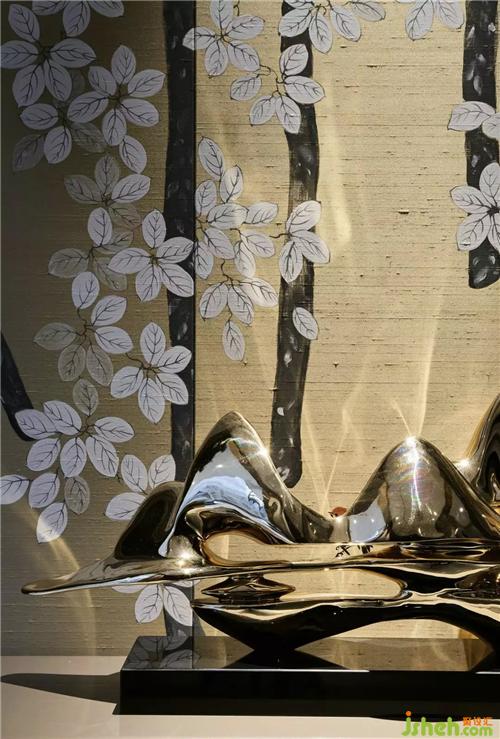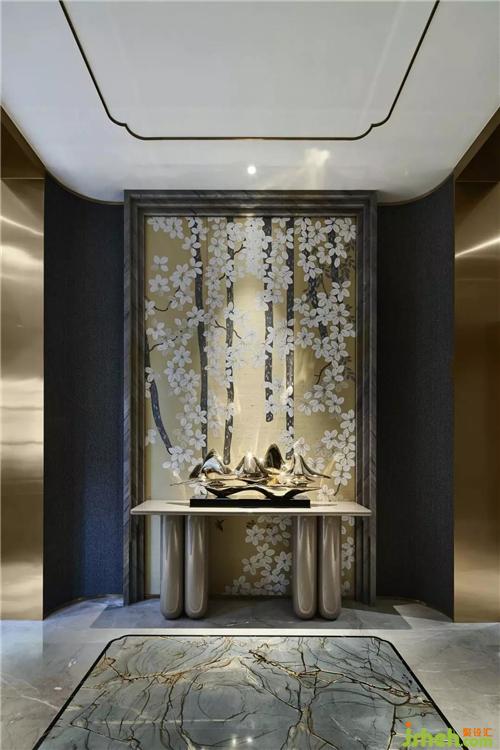 在這個遠離塵囂的法式合院里,更是于繁華都市中獨享一片寧靜,推開家門,撲面而來的繁花背景搭配金屬材質(zhì)的端景臺,豐富的材質(zhì)與色彩變化,增添雅奢趣味,方正開闊的空間,避免繁雜線條與多余家具,當居住者身處其中,亦能感受到空間開揚洗煉、明亮采光縈繞。