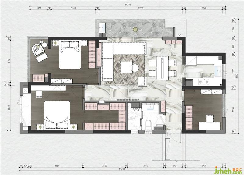 關于設計:原始戶型有2個并排的衛(wèi)生間,客戶希望更多一些儲物空間,在杭州裝修設計師調(diào)整之后,主臥的衛(wèi)生間改為衣帽間,孩子房的陽臺合并到臥室,空間變得整體,也更符合主人的使用需求。