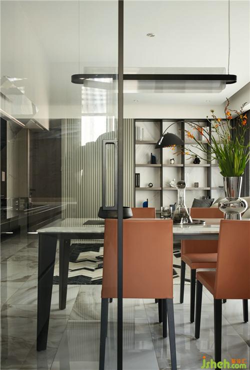 餐廳鋼琴配色的裝飾柜,在入戶一進門就視覺聚焦,提升空間的藝術氣息。